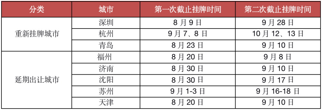 值得注意的是,由于土拍規則調整,第二次集中供地過程中,多城土地延期出讓或重新掛牌,譬如深圳、杭州、青島均停止掛牌之后重新掛牌,福州、濟南、沈陽、蘇州和天津等城市均延期出讓。就出讓時間來看,很多本該8月集中土拍的城市被擠壓至9月、10月。