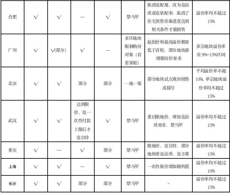 一是更多采用“限價+搖號”方式進行土地競拍,并且溢價率均有明顯下調。典型如廣州、南京、杭州、合肥等城市,溢價率上限均調整為15%;