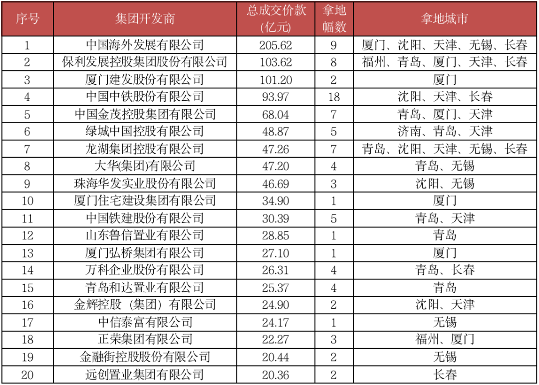 就拿地金額排名來看,中海、保利、廈門建發位列前三。其中中海、保利各自在5個城市均有拿地,拿地數量分別為9幅和8幅,廈門建發在廈門獲取了2幅地塊。
