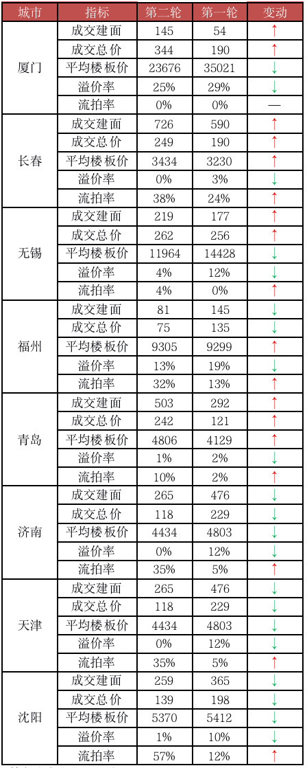 對比首輪集中土拍熱度來看,所有城市二輪集中土拍熱度均有所下滑:成交溢價率均較首輪有所降低,尤其是濟南、天津等低熱城市,溢價率降幅均在十個百分點以上;除廈門外,其余七市二輪流拍率均大幅走高,沈陽、長春、福州、濟南和天津等城市二輪土地出讓流拍率均超過了30%。