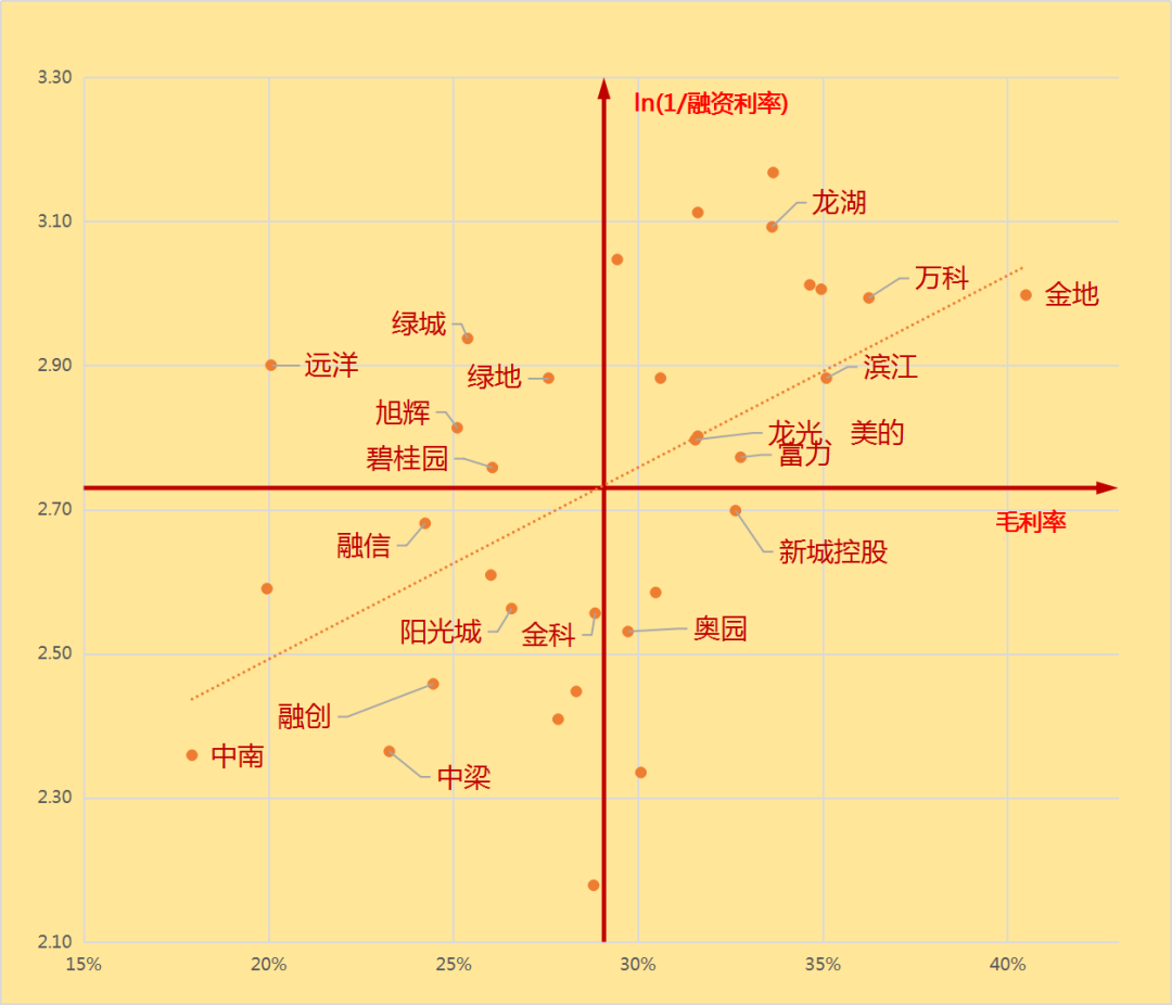 虛線下方絕大多數企業規模重于毛利,所以融資利率偏高。