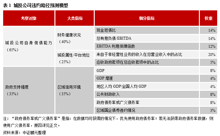 總之,要想解鎖城投公司風險暴露的路徑,必須構建一個同時考慮了城投公司自身償債能力和政府支持強度的評估體系,而且城投公司自身償債能力相關指標所占的權重總體上應大于政府支持強度所占的權重。考慮到城投屬性/平臺地位本身就是城投公司信用資質水平的重要決定因素,故將其與城投公司財務健康狀況結合起來進行考察,用于反映城投公司自身償債能力。權重方面,本文將城投公司自身償債能力的權重設定為65%,其中城投公司財務健康狀況的權重設定為40%,城投屬性/平臺地位的權重設定為25%;政府支持強度的權重設定為35%。對于各細分指標的權重,本文第二小節會具體介紹。