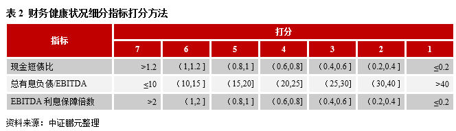 對于財務健康狀況所涉及的三個指標,均取近3年平均值。原因在于:此類指標的波動性通常較大,僅取近1年數值無法較為準確地反映城投公司的財務風險。比如,南京某經開區城投近3年的總債務/EBITDA分別為22.63、16.99、45.02;太倉市某城投近3年的EBITDA利息保障倍數分別為1.34、1.17、0.88;無錫市某經開區城投近3年的現金短債比分別為1.17、0.56、1.00,均呈現出明顯的波動性。權重方面,三個指標之間不存在明顯差異,原因在于它們都能較好地反映城投公司財務風險,只是角度不同。