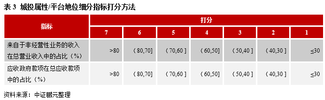 對于城投屬性/平臺地位所涉及的兩個指標,均取近3年平均值。監管環境持續收緊的背景之下,很多城投公司為了爭取持續生存發展而加快自身轉型步伐,有可能在職能定位、業務側重、發展戰略等多個方面較以往發生調整和變化,進而對城投公司的城投屬性/平臺地位產生較大影響。不過,即便剔除了監管壓力的影響,城投公司業務結構和應收對象結構本身也都存在較強的波動性,僅考察近1年的情況容易造成判斷失真,故將考察期間拉長至3年,有助于更準確地把握其城投屬性/平臺地位的真實水平。權重方面,兩個指標之間存在較大差異。之所以對應收政府款項占比僅設置5%的權重,而非經營性業務收入占比卻設置20%的權重,是因為:在業務層面,城投公司和地方政府發生關聯的程度越深,相關業務收入在總收入中的占比越大,就越能強化其城投屬性/鞏固其平臺地位;但應收款項層面,雖然應收政府款項占比越高確實能反映出城投公司參與地方建設的程度越深,不過這同時也意味著存在回款較慢、對城投公司形成資金占用的情況,因此本文雖然將該指標納入模型,但權重設置方面較為謹慎保守。