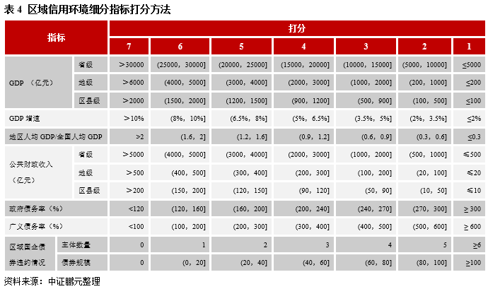 對于區域信用環境所涉及的指標,GDP、GDP增速、地區人均GDP/全國人均GDP、公共財政收入、政府債務率和廣義債務率均采用最近一年值,區域國企債券違約情況則用2014年國內債券市場出現首例違約事件以來的累計值。需要補充提示兩點:一是由于不同行政級別的經濟財力水平差異巨大,故在對GDP、公共財政收入進行打分時,模型對省級、地級、區縣級分別設置了打分標準;二是,之所以不優先使用廣義債務率指標,是因為該指標所涉債務僅包括區域發債城投中能夠獲取數據的有息債務,更不包括未發債的城投公司有息債務,數據并不全面,故可作為替代性考察指標納入模型但使用順序相對劣后;權重方面,對于反映區域經濟財政絕對實力的GDP、公共財政收入,均設置了8%的權重,高于反映區域經濟增長態勢、經濟相對發達水平的GDP增速和地區人均GDP/全國人均GDP;債務風險相關指標中,對政府債務率/廣義債務率設置了8%的權重,高于區域國企債券違約情況,原因在于:區域國企債券違約情況提示城投公司所屬省份在債券市場上的信用水平(比如永煤違約之后市場用腳投票,河南省城投公司凈融資額大幅縮水),能夠在一定程度上反映出當地政府對屬地國企債券違約實施救助的意愿和能力,但目前發生債券違約的國企中并沒有典型的城投公司,所以該指標的推斷性質更強,對城投違約的影響偏間接,所以對其設置的權重相對較低;同時,需要注意的是,區域國企債券違約情況考察兩個層面:一是違約主體的數量,二是違約債券的規模,打分時取兩者中孰低者,也即若按照違約主體的數量打分是6分,按照違約債券的數量打分是4分,則取4分,在計算總得分時是以4分乘以3%的權重,而非以6分乘以3%的權重。另外,還存在一個問題:不同地區對債市融資的依賴度存在較大差異,依賴度越高的地區,發債國企的數量和國企債券余額也就越大,發生違約的概率也就越大,反之則概率就越小,所以在考察區域國企債券違約情況的時候,必須要根據區域信用債余額進行相應的調整,使打分結果更具有參考價值。舉個例子:A省和B省國企債券的主體數量分別為2和6,違約規模分別為30億元和120億元,同時A省的存量信用債余額是B省的1/3,則在打分時,需要先對B省的主體數量和違約規模進行調整,經調整后的主體數量和違約規模分別為2(6*1/3)和40億元(120*1/3),所以最終A省、B省相關指標的得分最終是無差別的,即:主體數量得分均為5分,債券規模得分均為5分。
