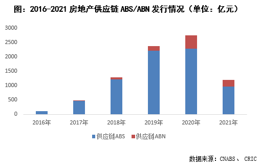 近幾年隨著房地產(chǎn)融資渠道如銀行信貸、私募資管計劃、委托貸款、銀信合作和海外債等的步步收緊,供應(yīng)鏈融資越來越成為企業(yè)補充資金來源的重要方式,特別是三條紅線以來,該方式可以有效幫助房企降低有息債杠桿。從2018年開始房地產(chǎn)供應(yīng)鏈ABS/ABN發(fā)行呈井噴式增長,2020年發(fā)行量達(dá)到2753億元,較2016年五年復(fù)合增長率達(dá)到126%。