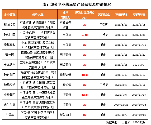 在2020年監(jiān)管窗口指導(dǎo)中,保理形式的資產(chǎn)證券化產(chǎn)品申請儲架發(fā)行,制造業(yè)企業(yè)ABS儲架額度最高可到100億元,房地產(chǎn)供應(yīng)鏈類ABS儲架規(guī)模被降至20億元,且新申請儲架發(fā)行已經(jīng)很難獲批。該窗口指導(dǎo)在企業(yè)的申請情況中可以窺見,根據(jù)上交所備案數(shù)據(jù),近期房地產(chǎn)企業(yè)申請的供應(yīng)鏈產(chǎn)品額度最高為20億元,碧桂園、隆基泰和、寶龍等近期通過的供應(yīng)鏈資產(chǎn)支持計劃額度均為20億元。