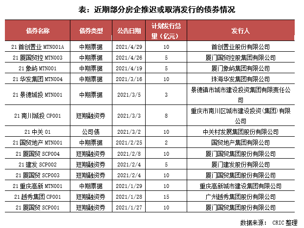 與此同時,2020年以來企業(yè)信用債暴雷頻發(fā),且逐步波及到排名較前的中大型房企,從而引發(fā)債券市場動蕩。截止2021年5月26日,房企債券違約金額約達(dá)296.78億元,較2020年增長56%,在此情況下,疊加融資收緊的政策壓力,債券市場近期較為動蕩,首創(chuàng)、廈門國貿(mào)等近期取消了多筆中期票據(jù)以及融資券的發(fā)行,企業(yè)信用債融資也受到較大的影響。而海外融資受近期境內(nèi)債違約、美元上調(diào)、海外疫情等多重因素的影響,房企境外發(fā)債較少,截止4月底的發(fā)行量占總債券的48%,比2020年同期低潮期還低2個百分點。