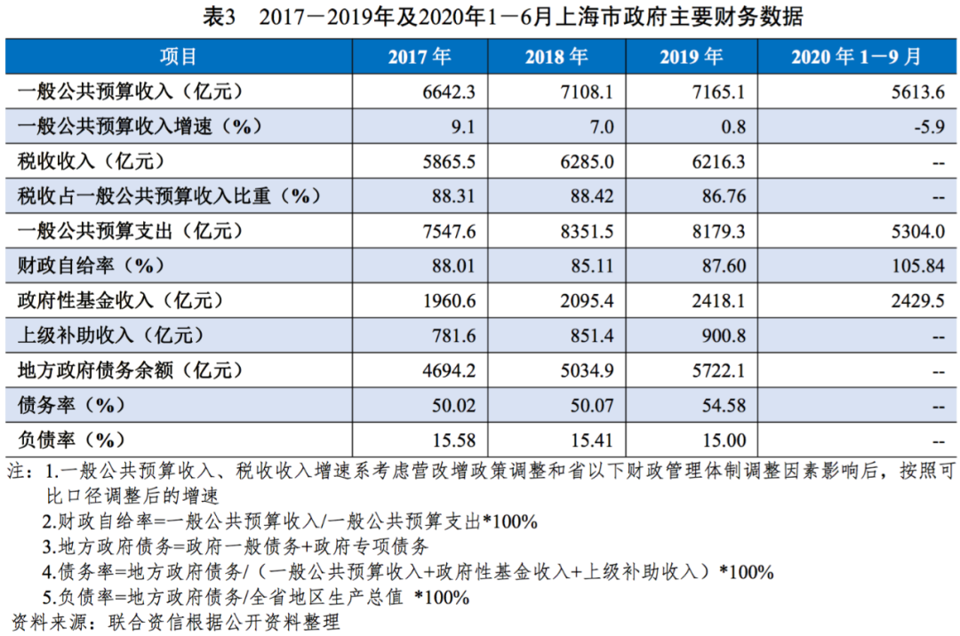 近年來上海市財政收入持續增長,2019年一般公共預算收入規模位居全國第三,一般公共預算收入穩定性強且財政自給率較高。上海市政府負債務負擔輕,整體償債能力強,在政府債務限額以內尚有較大舉債空間。