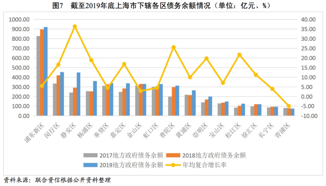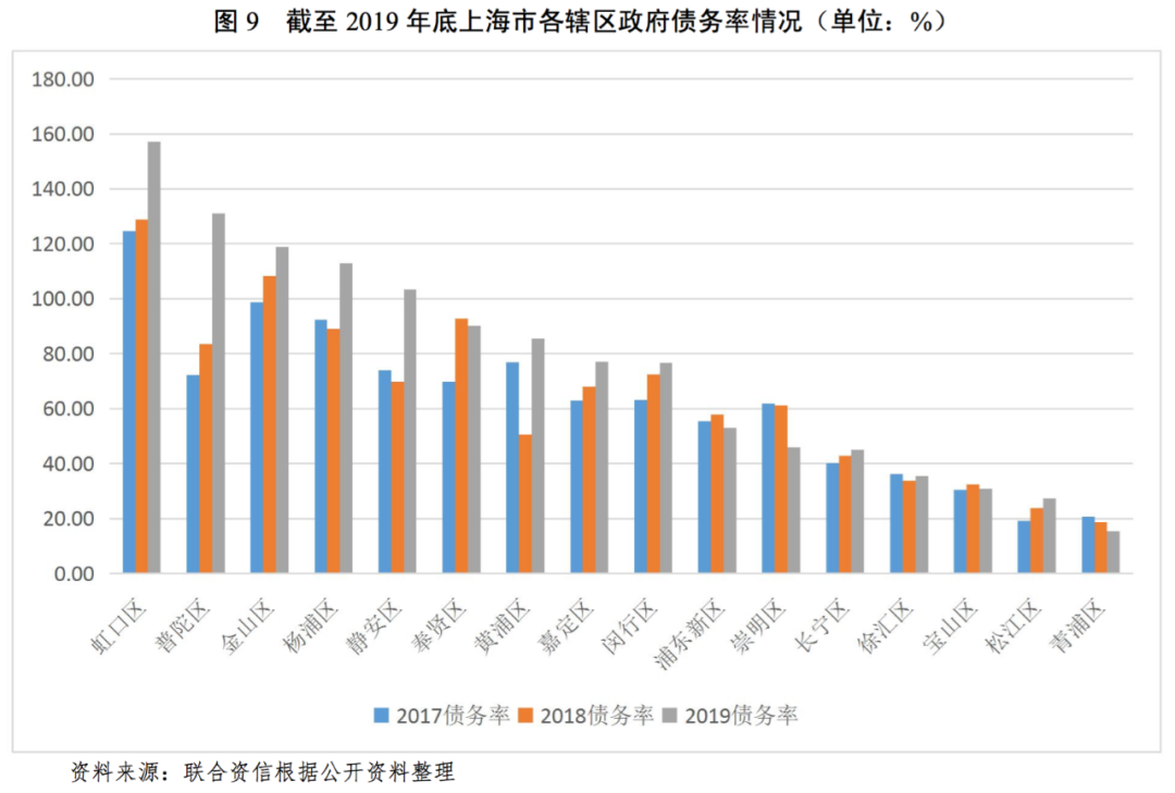 償債能力方面,截至2019年底,靜安區、普陀區、虹口區、楊浦區和金山區5個轄區政府債務率達到100%以上,增幅較快;嘉定區、黃浦區、閔行區和奉賢區4個轄區政府負債率在75%~95%之間,徐匯區、長寧區、崇明區、寶山區和浦東新區5個轄區政府負債率在30%~65%之間,松江區和青浦區政府債務率低于30%。整體看,上海市各轄區政府債務率有所分化,部分核心城區債務率較高,償債能力有所下降。