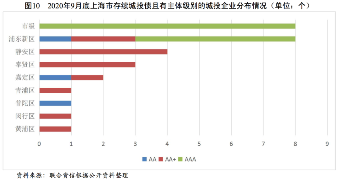 截至2020年9月底,上海市有存續債的城投企業共29家,其中市級城投企業8家,區級城投企業21家,從區級城投企業數量及分布來看,浦東新區有存續債城投企業8家,靜安區4家,奉賢區3家,嘉定區2家,閔行區、黃浦區、普陀區、青浦區各1家,徐匯區、長寧區、虹口區、楊浦區、寶山區、金山區、崇明區和松江區尚無有存續債的城投企業。從主體信用等級分布看,AAA級城投企業有13家,其中8家為上海市級城投企業,5家為浦東新區所屬城投企業;AA+級城投企業13家,其中靜安區、奉賢區、閔行區、青浦區、黃浦區的所有存續債城投企業均達到AA+;AA級城投企業3家。