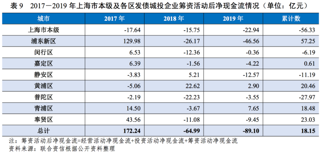 從籌資活動后凈現金流來看,2017—2019年,上海市本級和各區城投企業籌資活動后凈現金流持續下降,2018年整體由凈流入轉為凈流出,其中上海市本級和普陀區籌資活動后凈現金流持續凈流出,三年累計凈流出56.33億元和27.97億元,表明其持有現金持續減少,若城投企業持有的現金較上年有所減少,則未來面臨的償債壓力將有所加大。
