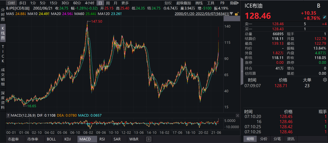 受此影響,國(guó)際油價(jià)大漲,美、布期貨開盤漲10%。其中一度升至135美元/桶,WTI期貨突破130美元/桶。