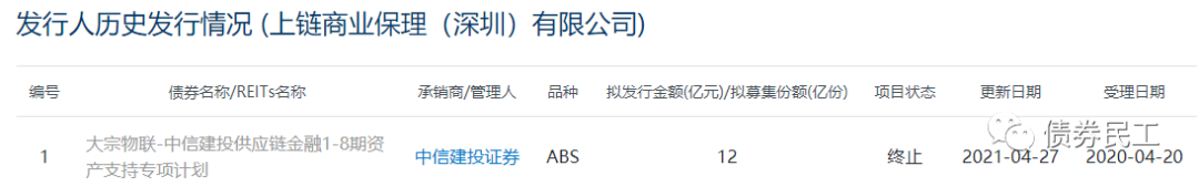 5、大宗物聯(lián)-中信建投供應(yīng)鏈金融1-8期資產(chǎn)支持專(zhuān)項(xiàng)計(jì)劃擬發(fā)行規(guī)模為12億元,發(fā)行人為上鏈商業(yè)保理(深圳)有限公司,此前未申報(bào)過(guò)ABS產(chǎn)品。