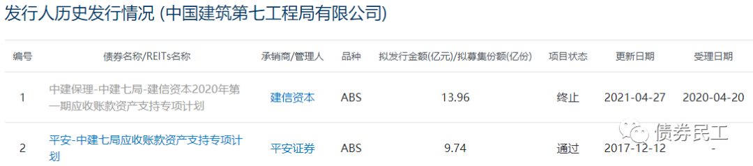 4、中建保理-中建七局-建信資本2020年第一期應(yīng)收賬款資產(chǎn)支持專(zhuān)項(xiàng)計(jì)劃擬發(fā)行規(guī)模為13.96億元,發(fā)行人為中國(guó)建筑第七工程局有限公司,此前申報(bào)過(guò)一單ABS產(chǎn)品:2017年申報(bào)的總額為9.74億元的產(chǎn)品通過(guò)。