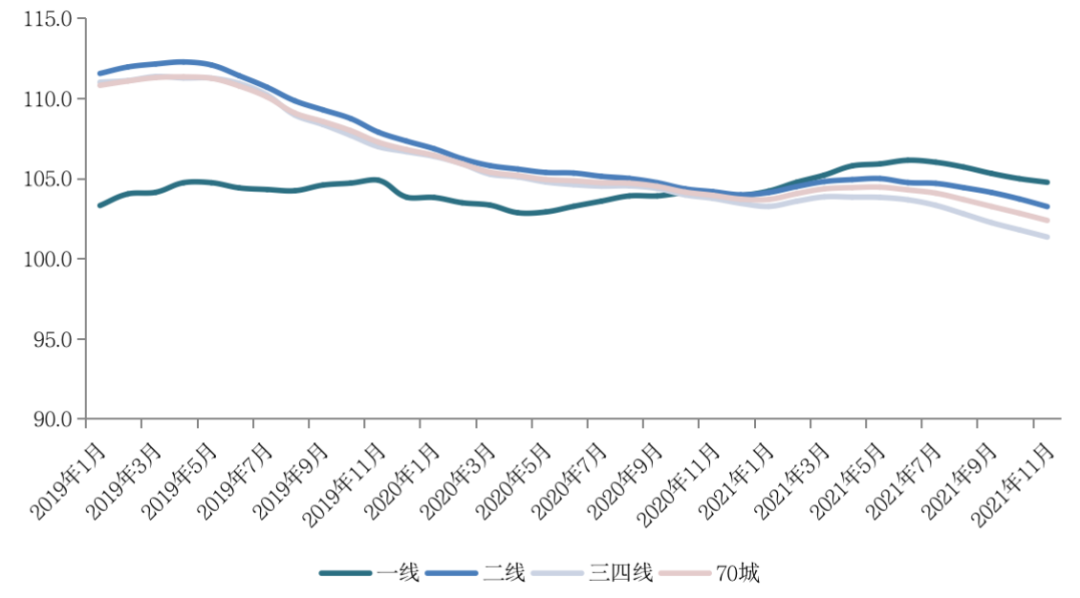 從全國70個大中城市商品住宅銷售價格來看,2021年11月份,70個大中城市商品住宅銷售價格環比延續下降態勢,同比漲幅持續回落。