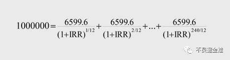 例如,某個人住房貸款,期限為20年,按月還款,共240期,本金為100萬元,采用等額本息方式還款。按照還款計劃,從借款后第一個月末起,借款人每月等額償還本息6599.6元。上述貸款以單利計算的年化利率約為5%。以IRR方法計算的年化利率約為5.12%,計算過程為: