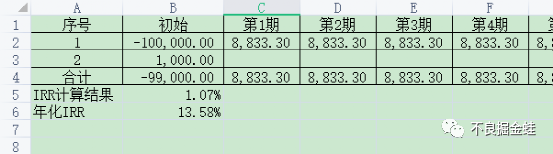這種其實小貸或者網貸比較多,同樣是創建一個表格,輸入對應的現金流,同樣是12期都要輸入哦。在B5位置輸入公式=IRR(B4:N4),在B6位置輸入公式=(1+B5)^12-1。這里和上面不一樣的是金融機構支出10萬的時候當期有一筆1000元的進賬,實際支出只有99000元。