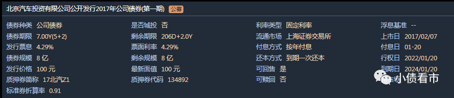 《小債看市》統(tǒng)計(jì),目前北汽投資僅存續(xù)“17北汽01”一只債券,當(dāng)前余額8億,票息4.29%,期限為7(5+2)年,將于2024年1月20日到期,明年1月面臨回售。