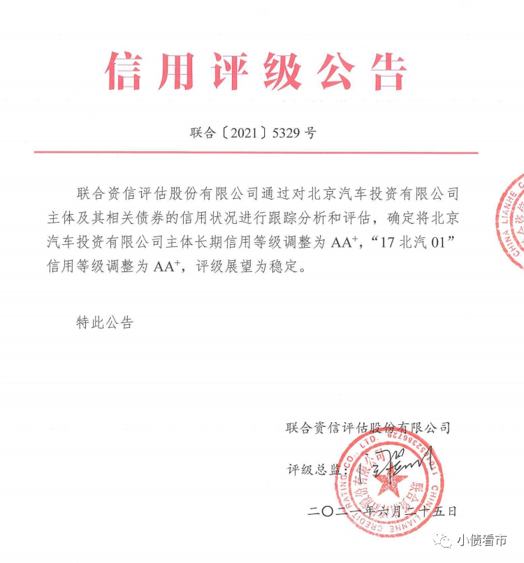 6月28日,聯(lián)合資信公告稱,確定將北京汽車投資有限公司(以下簡(jiǎn)稱“北汽投資”)主體長(zhǎng)期信用等級(jí)調(diào)整為AA+,“17北汽01”的信用等級(jí)為AA+,評(píng)級(jí)展望為穩(wěn)定。