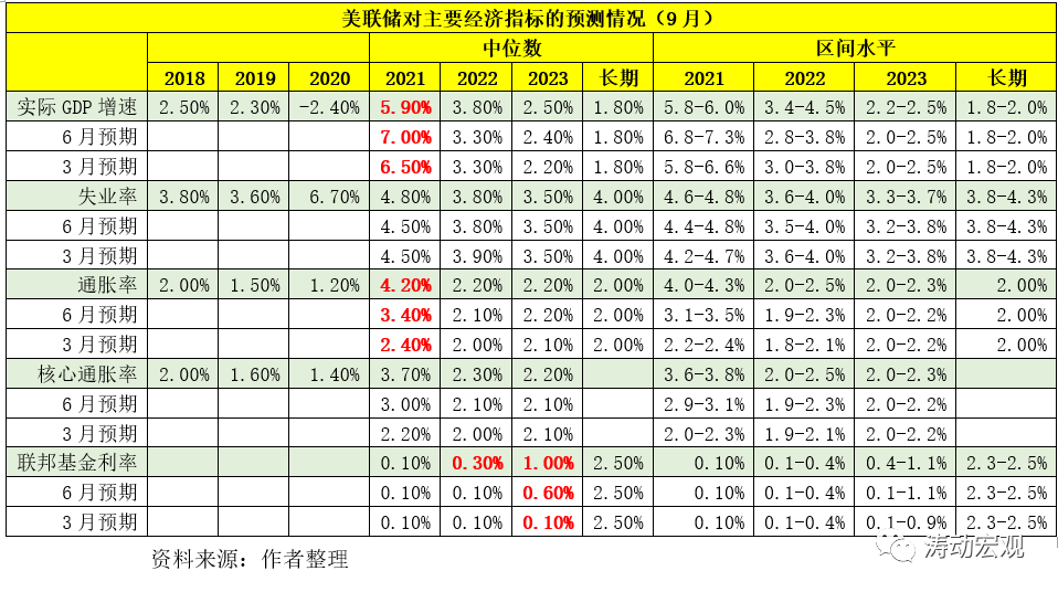 (一)雖然此次會議上,美聯(lián)儲維持聯(lián)邦基金目標(biāo)利率不變、維持每月增持至少800億美元的美國國債和500億美元的MBS不變,延續(xù)了近期幾次議會議的總體基調(diào)。但從對2021年-2025年的經(jīng)濟(jì)指標(biāo)預(yù)測情況以及鮑威爾的發(fā)言來看,醞釀了多月的Taper極有可能在今年11月正式啟動,真正拉開Taper序幕。