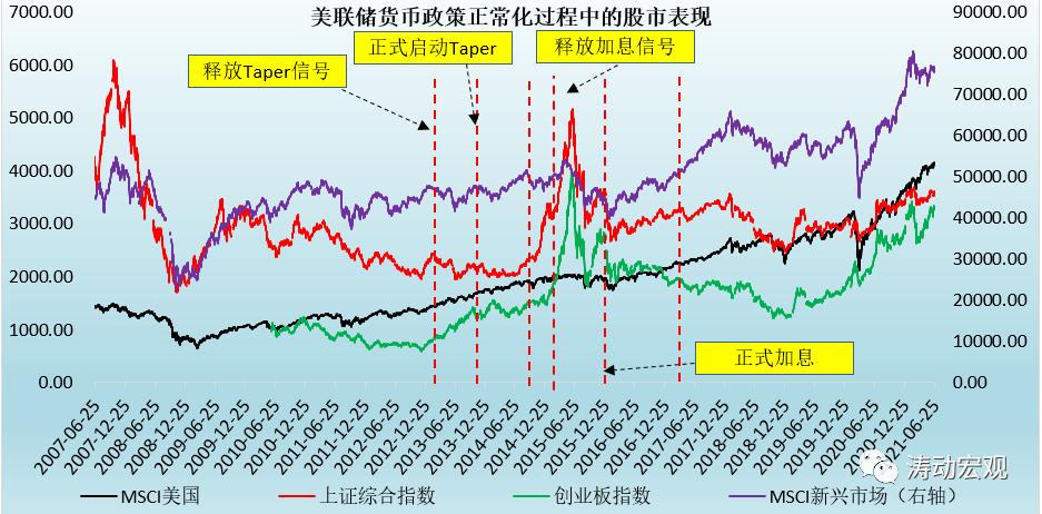 2、而在Taper以及加息的預(yù)期過程中,受資本外流、本幣貶值等因素影響,新興市場股市的波動幅度有所擴(kuò)大,且傾向于下挫。