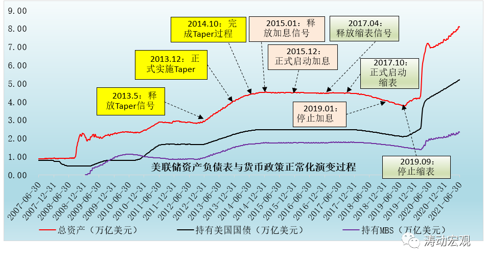 前面已經(jīng)指出,美聯(lián)儲的貨幣政策正常化路徑基本上遵循“向市場釋放Taper信號——Taper過程——向市場釋放加息信號——加息——向市場釋放縮表信號——正式縮表”的邏輯脈絡(luò)。