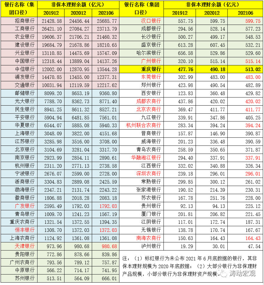 3、除以上28家銀行外,還有13家銀行的非保理財規(guī)模超過了500億元,從高到低依次為天津銀行、貴陽銀行、廣州農(nóng)商行、中原銀行、蘇州銀行、齊魯銀行、漢口銀行、成都銀行、長沙銀行、盛京銀行、哈爾濱銀行、廣州銀行以及重慶銀行。這13家銀行的非保本理財規(guī)模加在一起不足8000億元,未來的規(guī)模大概率也會不斷被壓縮。