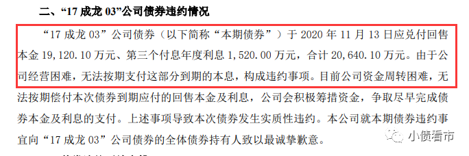11月13日,成龍建設集團有限公司(以下簡稱“成龍集團”)公告稱,“17成龍03”于2020年11月13日應兌付回售本金19120.1萬元、第三個付息年度利息1520萬元,合計20640.1萬元。由于公司經營困難,無法按期支付這部分到期的本息,構成違約事項。