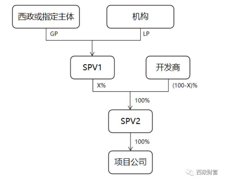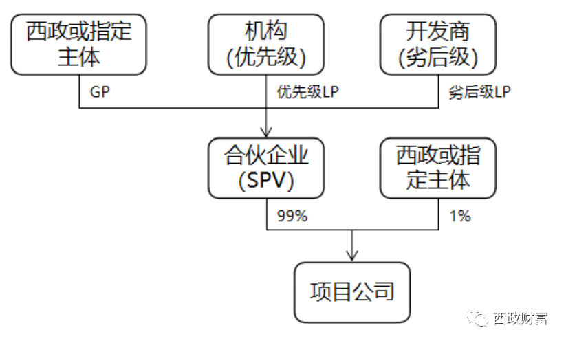 1. 由西政或指定主體擔(dān)任GP,機(jī)構(gòu)優(yōu)先級(jí)LP、開發(fā)商劣后級(jí)LP共同設(shè)立合伙企業(yè)(SPV),西政或指定主體與SPV設(shè)立項(xiàng)目公司(因合伙企業(yè)不得100%持有有限公司的股權(quán),因此1%的股權(quán)實(shí)際為代持性質(zhì))。