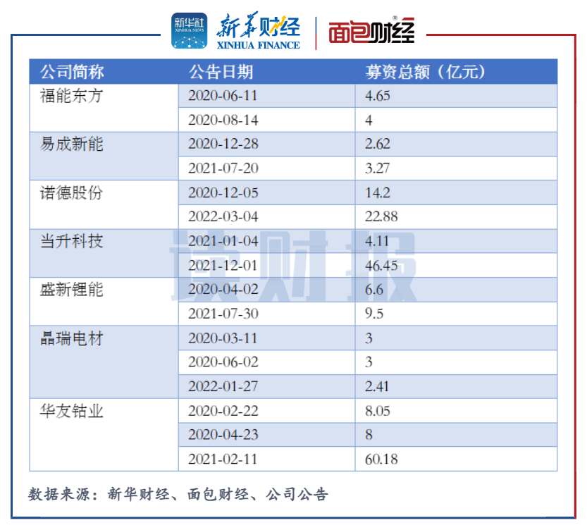 諾德股份在2020年12月和2022年3月通過定增分別募資14.2億元和22.88億元。當升科技在2021年1月和12月通過定增分別募資4.11億元和46.45億元。華友鈷業(yè)在2020年2月、4月和2021年2月通過定增分別募資8.05億元、8億元和60.18億元。其余還有四家鋰電池板塊上市公司均完成兩次及以上定增募資。