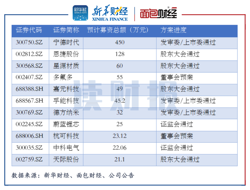 同時,鋰電池板塊中還有約20家上市公司的定增方案正在辦理過程中,合計的募資總額超950億元。