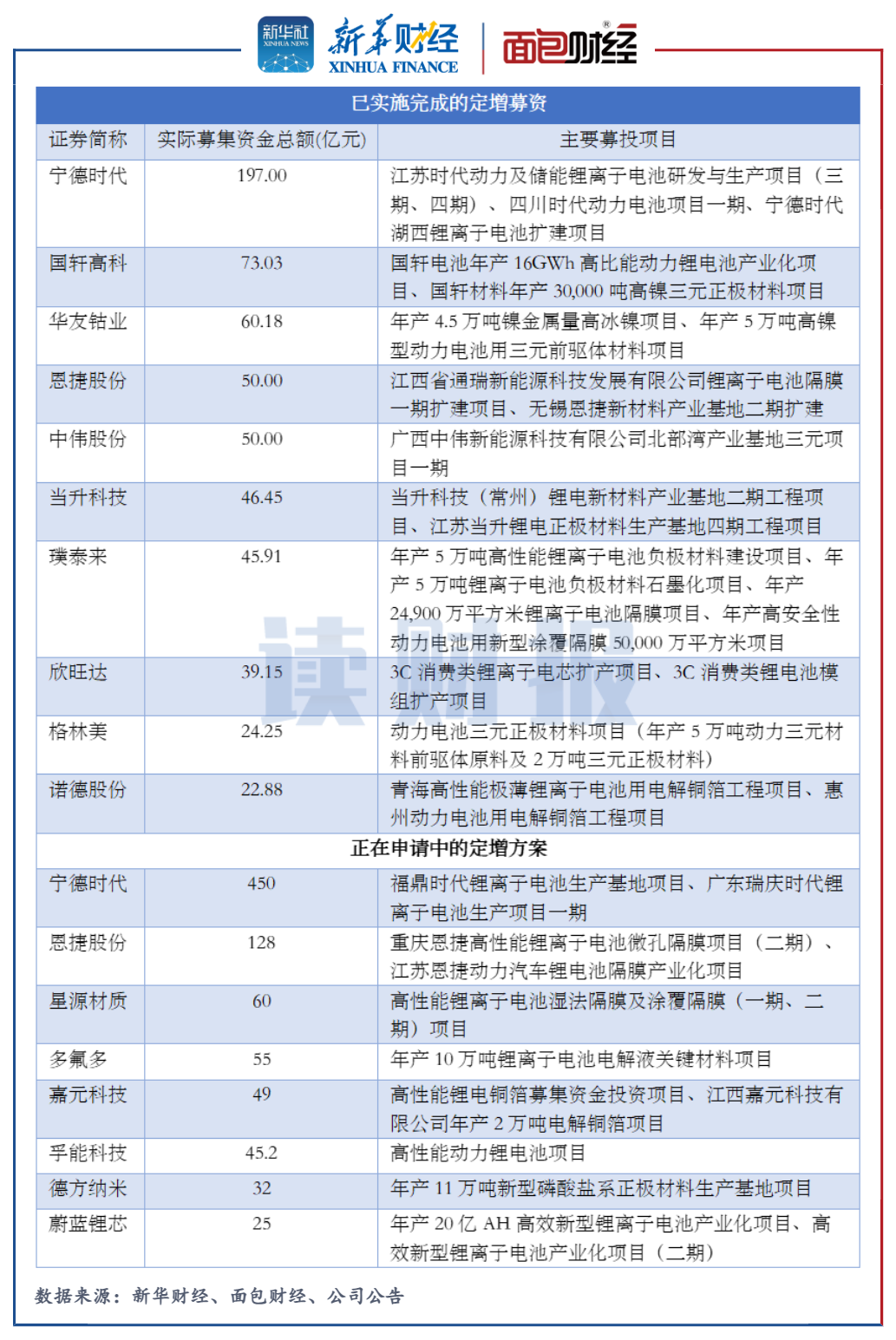 在鋰離子電池領域,寧德時代、欣旺達、億緯鋰能均已完成定增分別募資197億元、39.15億元和25億元用于建設鋰離子電池項目。寧德時代還有450億元的定增方案計劃建設鋰離子電池生產(chǎn)基地。