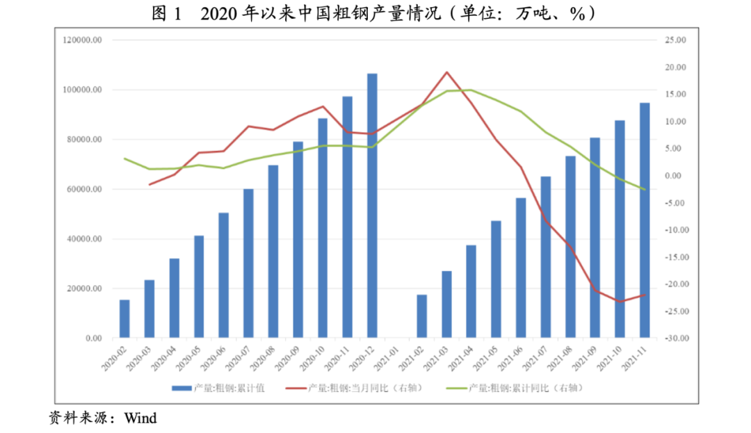 2021年以來,受政策調控影響,月度粗鋼產量呈現先增后降趨勢,1―11月累計粗鋼產量出現同比下降,預計全年可實現減產目標;鋼材價格先升后降,整體處于歷史高位,行業效益大幅上升,資產負債率處于歷史較低水平。