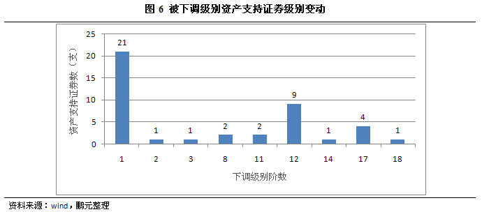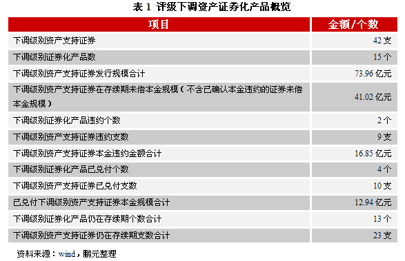 根據wind,截至目前,共有42只資產支持證券發生級別下調,涉及相關證券化產品共15只證券化產品,下調級別的資產支持證券發行規模合計73.96億元,存量規模(不含已確認本金違約的證券未償本金規模)合計41.02億元(見表1及文末附表)。在目前被下調級別的證券化產品中:4個產品已兌付完畢,已有2個產品確認違約[2],其中大成西黃河大橋通行費收入收益權專項資產管理計劃及平銀凱迪電力上網收費權資產支持專項計劃(二期)發生本金違約。級別被下調及已違約資產支持證券本金規模分別占國內證券化市場發行總體規模比例為0.19%及0.04%,占比極小。總體來看,目前國內證券化市場風險可控。
