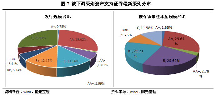 從級別下調程度來看[3],共有21支資產支持證券級別被下調1個級別階數[4],9支資產支持證券級別被下調12個級別階數,4支資產支持證券被下調17個級別階數(見圖6)。被下調資產支持證券的最新級別主要分布于AA、C及B,被下調資產支持證券且仍處于存續期內的資產支持證券級別主要分布于AA、B+及B(見圖6及圖7)。總體來看,相對于傳統債券,國內資產支持證券被下調級別的數目較少,但單次下調的幅度會高于傳統債券單次下調的幅度,這也是資產支持證券評級與傳統債券評級的主要差異之一(BIS,2005)。