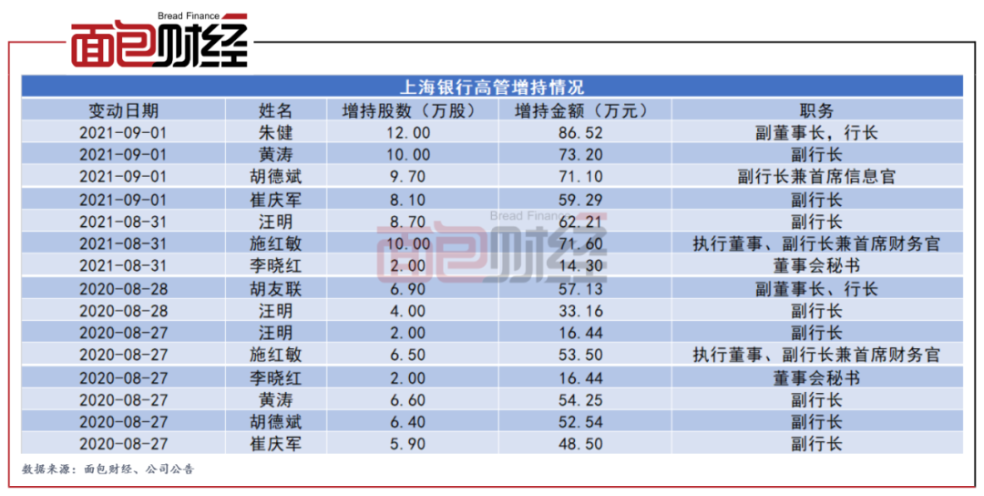 2021年9月初,上海銀行發布高管買入公司股票公告。根據上交所信披數據計算,包括行長、副行長在內的7位高管分別于2021年8月31日至9月1日期間以自有資金從二級市場買入公司A股股票,合計增持60.5萬股,合計增持金額約為438.21萬元。