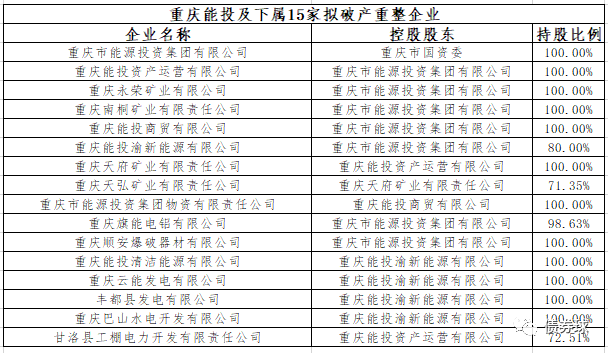據(jù)報(bào)道,重慶能源集團(tuán)等16家企業(yè)申請破產(chǎn)重整,經(jīng)查詢,除重慶能投外,其他15家公司均為重慶能投控股子公司。從相關(guān)信息來看,本次破產(chǎn)重整似乎早有計(jì)劃。