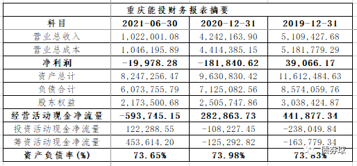 從公開披露信息來看,重慶能投最近兩年一期為2019年至2021年半年報(bào),其主營業(yè)務(wù)收入呈現(xiàn)下滑趨勢,凈利潤則大幅下降,并出較大幅度的虧損;經(jīng)營活動現(xiàn)金凈流量處于不斷下降,甚至惡化的狀態(tài);而資產(chǎn)負(fù)債率則相對平穩(wěn),但是負(fù)債率較高,接近74%,總體來看財(cái)務(wù)情況并不理想。