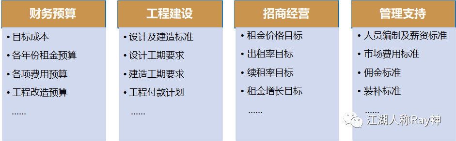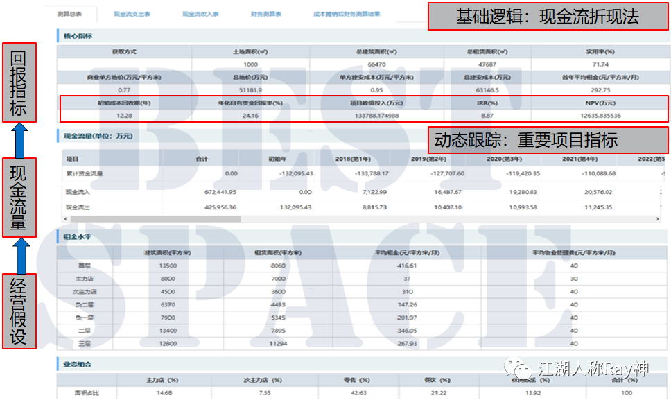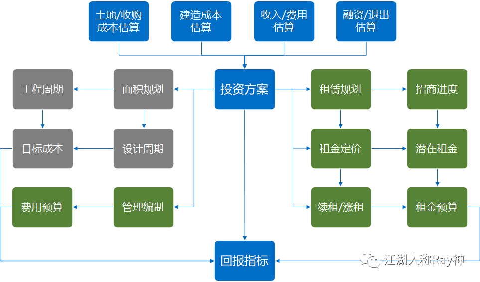 這一過程所做的事情,簡單來說就是根據投資回報要求來規劃自己的投資方案,確定出這一方案對成本投入、收入結構、費用支出、建設周期、出租率等的要求。即:投資測算就是制定目標的過程,投資回報的實現是建立在這些目標完成的基礎上的。