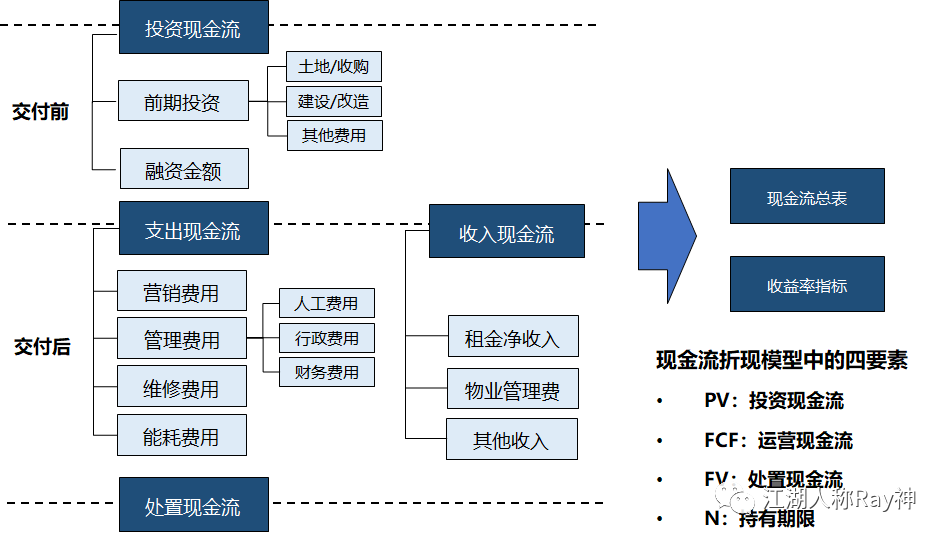 所有做投資測算的工具,無論針對于哪種類型資產,其基本原理都是相通的。即:通過一定的方法得到所投資項目在投資期限內的各項現金流,然后計算出對應的回報指標。這些回報指標可以根據資產獲取方式及投資期限的不同而有所差異,比如:每年的經營收益率(NOI Yield)、凈資產回報率(ROE)、經營利潤率(EBITDA Margin)或是整個投資期的內部收益率(IRR)、凈現值(NPV)等等。而作為支撐這些指標的計算所需要預估的現金流包括:投資多少錢、過程中每年的收支、處置時獲得多少錢。