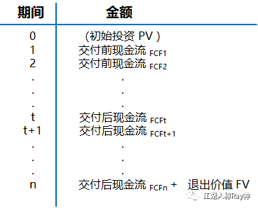 這一模型中對于指標的影響因素除了各項現金流外,還有一個因素就是時間期限——同樣的現金流發生的時間不同,對投資者而言回報自然也是不同的。投資領域經常會用一個T型圖來衡量這些現金流與時間的關系,并結合現金流折現的方式來衡量時間的價值。