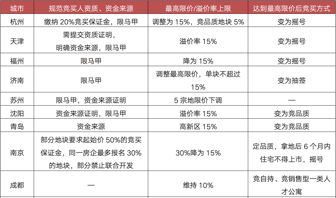 基于此,8月10日自然資源部召開閉門會議,要求集中供地城市優化第二批次土地出讓政策,隨后,各大城市臨時中止土拍,紛紛調整土拍規則,只要涉及三大方面: