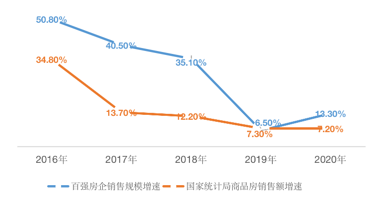 圖:2016年-2020年百強房企及行業增速(銷售金額)