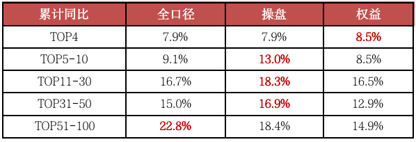 據克而瑞重點監測的40家房企增速來看,增速在20%以上的房企有14家,從百強各梯隊房企不同口徑業績增速對比來看,前四強房企全口徑業績平均增速僅為7.9%,TOP5-10房企全口徑業績平均增速僅為9.1%。