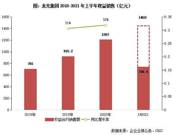 2021年上半年,龍光連續(xù)6個月業(yè)績均破百億,累計實現(xiàn)權(quán)益銷售額736.4億元、權(quán)益銷售面積390.5萬平方米,分別同比增長58.9%、28.3%。按全年1450億元銷售目標算,上半年目標完成率達到50.8%。從供貨安排來看,下半年可售貨值有1560億元,新開盤項目有33個,繼續(xù)保持銷售節(jié)奏,大概率會達成年度目標。