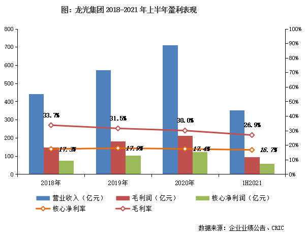 在行業(yè)利潤率普遍下滑背景下,上半年公司毛利率27%,較2020年微降3個百分點,明顯低于行業(yè)平均降幅。盈利能力保持穩(wěn)定,競爭優(yōu)勢持續(xù)穩(wěn)固。未來,龍光保證、提升自身的盈利能力,需進一步加強土地成本控制、提高管理效能。