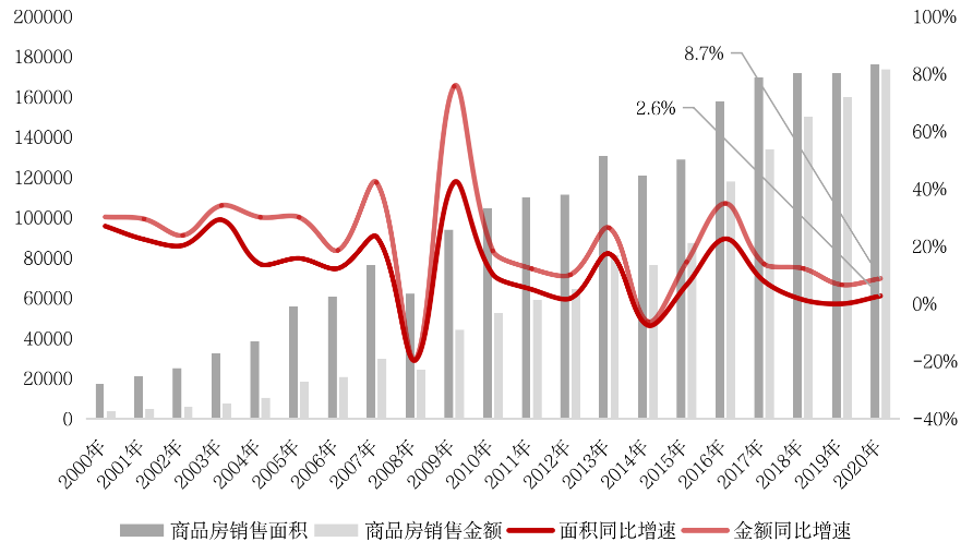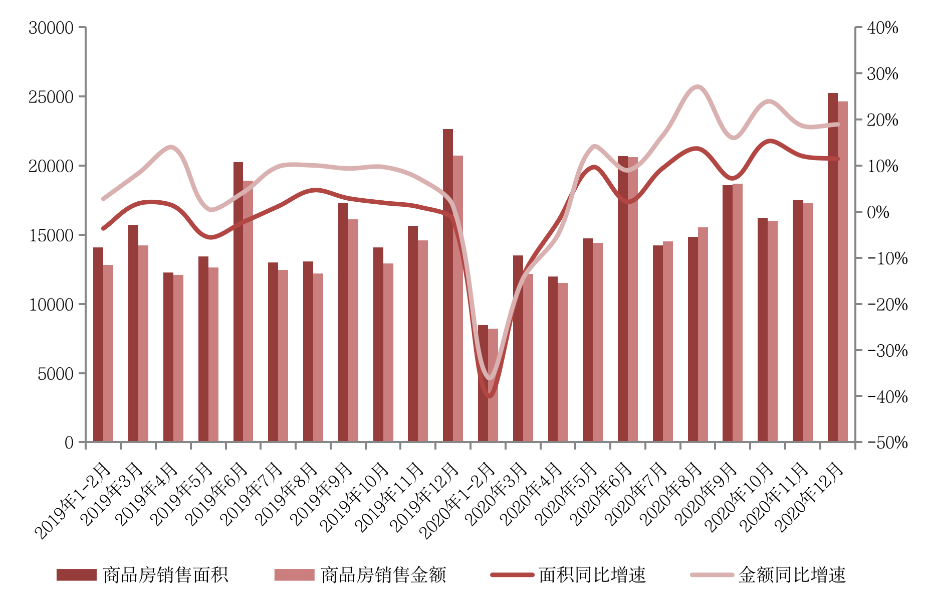 2020年,行業銷售數據整體超預期,全國商品房銷售面積達到17.6億平方米,同比增長2.6%,比預期增加1.1個百分點,增速比前11月提高1.3個百分點。其中,住宅銷售面積15.5億平方米,同比增長3.2%。商品房銷售額17.4萬億元,增長8.7%,增速比前11月提高1.5個百分點,比上年提高2.2個百分點。其中,住宅銷售額15.5萬億元,增長10.8%。