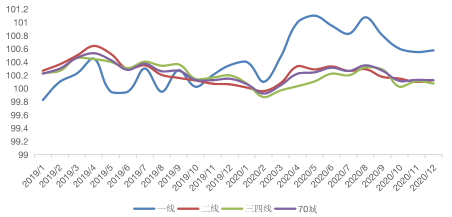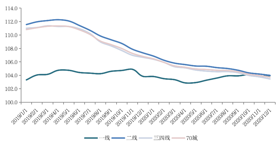 從全國70個大中城市商品住宅銷售價格來看,70城房價穩中略漲,其中一手房房價同比僅一線城市漲幅擴大,二線及三四線城市漲幅均繼續收窄。二手房市場房價表現與一手房一致,其中一線城市12月環比翹尾,漲0.5%漲幅擴大。其余各能級城市整體環比漲幅均持平或收窄。