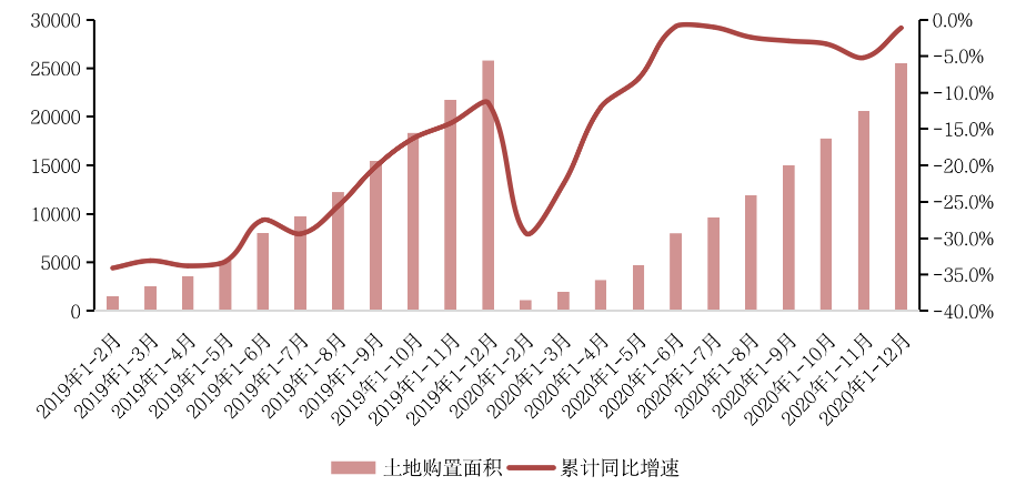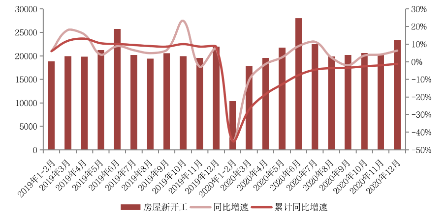 但值得注意的是,對比來看12月同比增速略低于2019年同期7.4%同比增速。一方面,2020上半年房企土地購置面積仍處于歷史低位,待開發土地的減少制約了新開工面積的增長;另一方面融資收緊導致房企對開工繼續采取保守態度,在新開工進度上審慎而行。